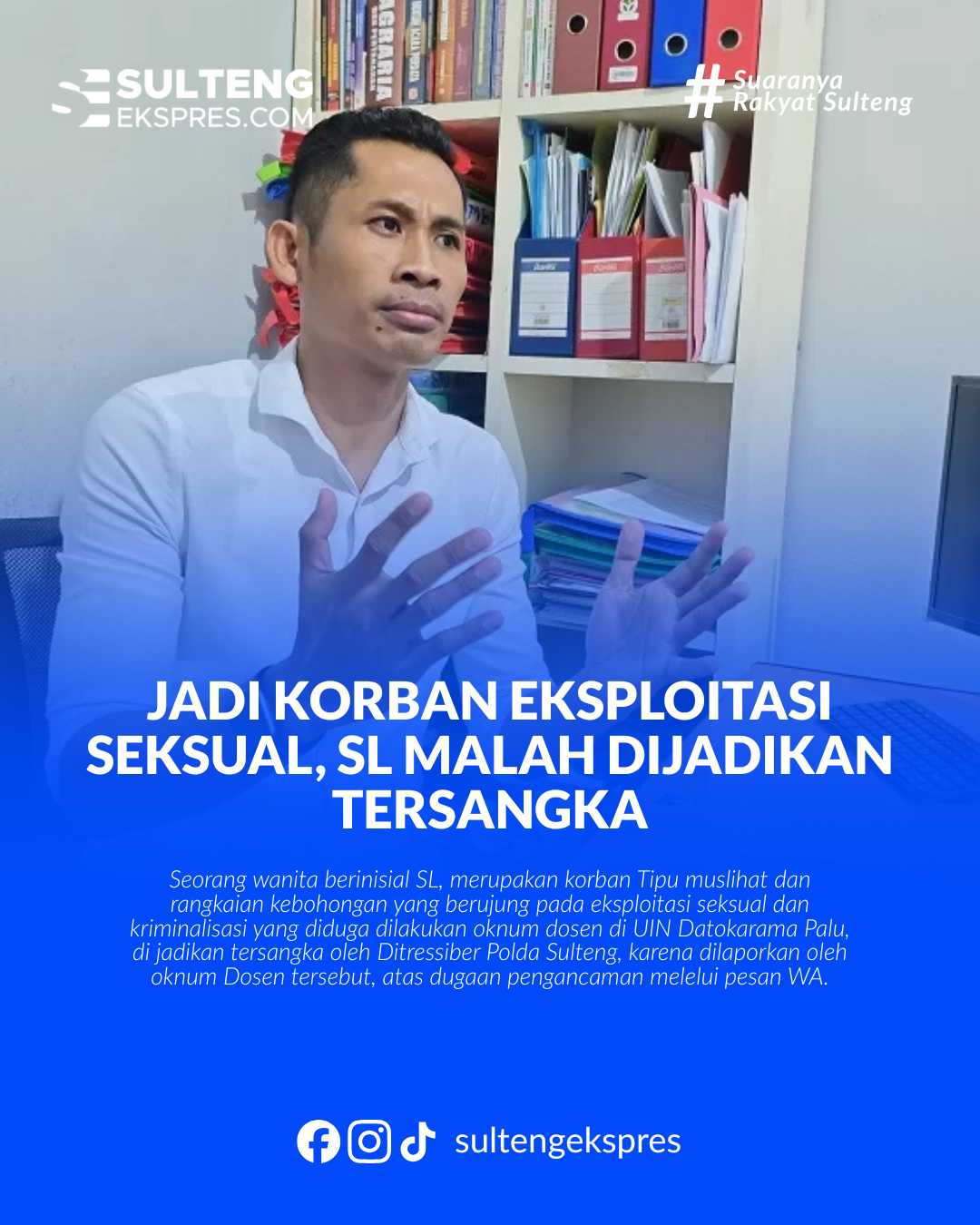 Palu, Sultengekspres.com – Seorang wanita berinisial SL, merupakan korban Tipu muslihat dan rangkaian kebohongan yang berujung pada eksploitasi seksual dan kriminalisasi yang diduga dilakukan oknum dosen di UIN Datokarama Palu, di jadikan tersangka oleh Ditressiber Polda Sulteng, karena dilaporkan oleh oknum Dosen tersebut, atas dugaan pengancaman melelui pesan WA.