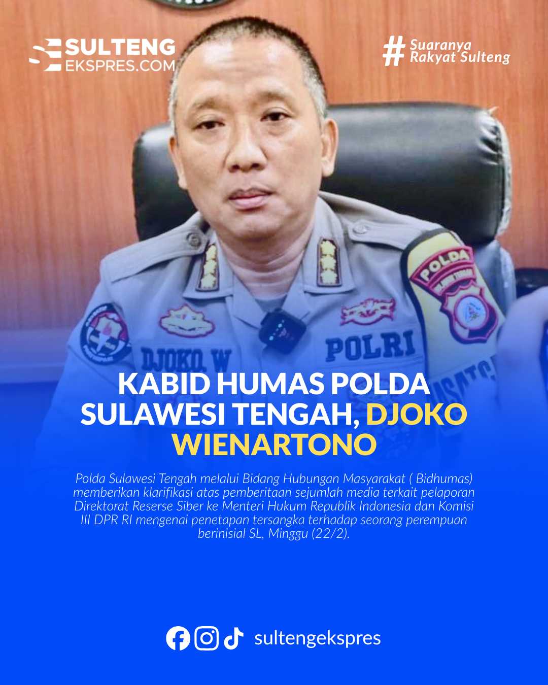 Palu, Sultengeskpres.com –  Polda Sulawesi Tengah melalui Bidang Hubungan Masyarakat ( Bidhumas) memberikan klarifikasi atas pemberitaan sejumlah media terkait pelaporan Direktorat Reserse Siber ke Menteri Hukum Republik Indonesia dan Komisi III DPR RI mengenai penetapan tersangka terhadap seorang perempuan berinisial SL, Minggu (22/2).